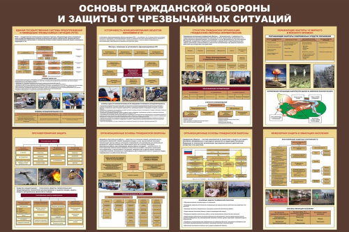 На стенде представлена информация о разных аспектах основ гражданской обороны и защиты от чрезвычайных ситуаций.