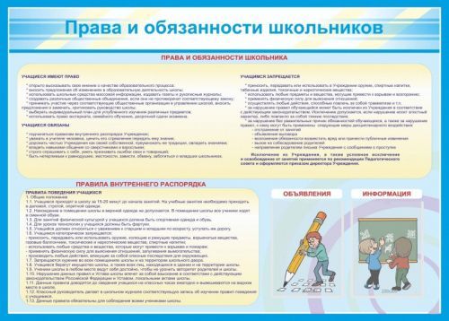 На стенде представлена информация о правах и обязанностях школьника, а также о недопустимом поведении в школе и правилах внутреннего распорядка. В вертикальных карманах можно размещать важные объявления.