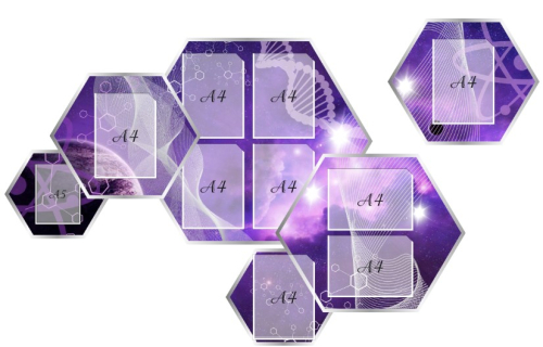 Резная информационная доска включает в себя 2 части. Первая представлена шестиугольником с одним прозрачным карманом А4. Вторая часть состоит из 5-ти шестиугольных стендов с карманами А4 (2 горизонтальных, 6 вертикальных) и А5.