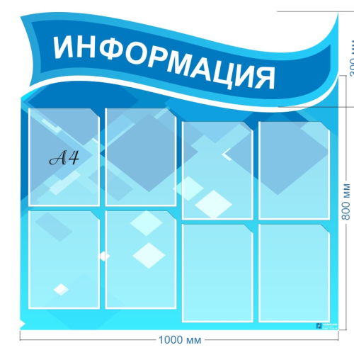 Резной стенд состоит из фигурной таблички «Информация» и доски с волнообразным верхом. В прозрачных карманах вертикально размещаются листы бумаги с объявлениями, справочными данными, расписаниями. Есть прорези для удобства замены содержимого.