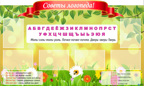 На стенде представлены русский алфавит и некоторые упражнения на отработку звуков. В двух вертикальных и четырех горизонтальных прозрачных карманах можно размещать полезную информацию, объявления и важные советы специалиста.