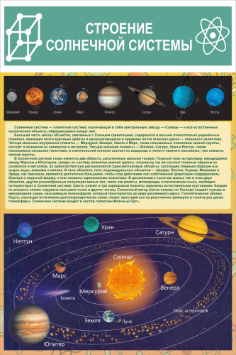 Стенд включает подробную информацию о строении Солнечной системы. Содержит иллюстрации всех планет с подписями, а также цветную схему строения.