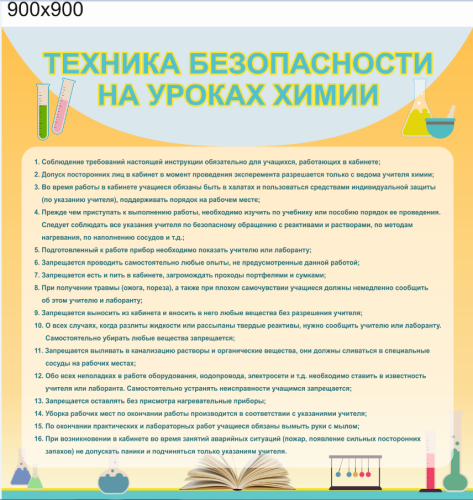 Безопасность детей в образовательных учреждениях также важна, как и получение ими знаний по школьной программе. На стенде «Техника безопасности на уроках химии» дети смогут прочесть всю необходимую информацию по соблюдению техники безопасности на уроке.
