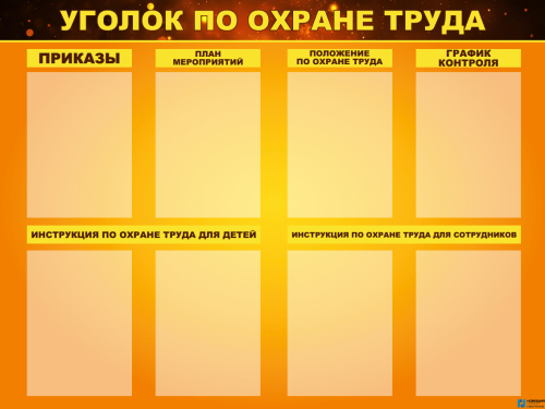 Информационное поле стенда разделено на 6 частей: «Положение по охране труда», «План мероприятий», «График контроля», «Приказы», «Инструкция по охране труда для детей», «Инструкция по охране труда для сотрудников».