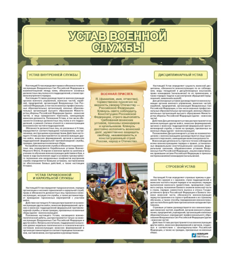 Стенд оформлен в оттенках хаки и содержит выдержки из устава военной службы. Предназначен для информирования юношей, которые после окончания школы будут призваны в ряды армии РФ.