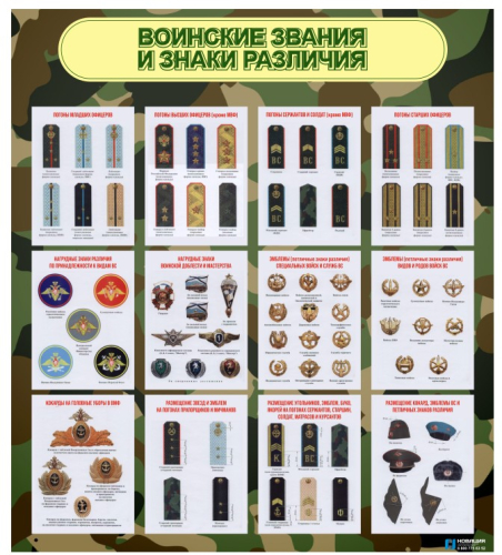 На красочном информационном поле, разделенном по темам, изображены погоны, шевроны и кокарды представителей ВС РФ с подписями.