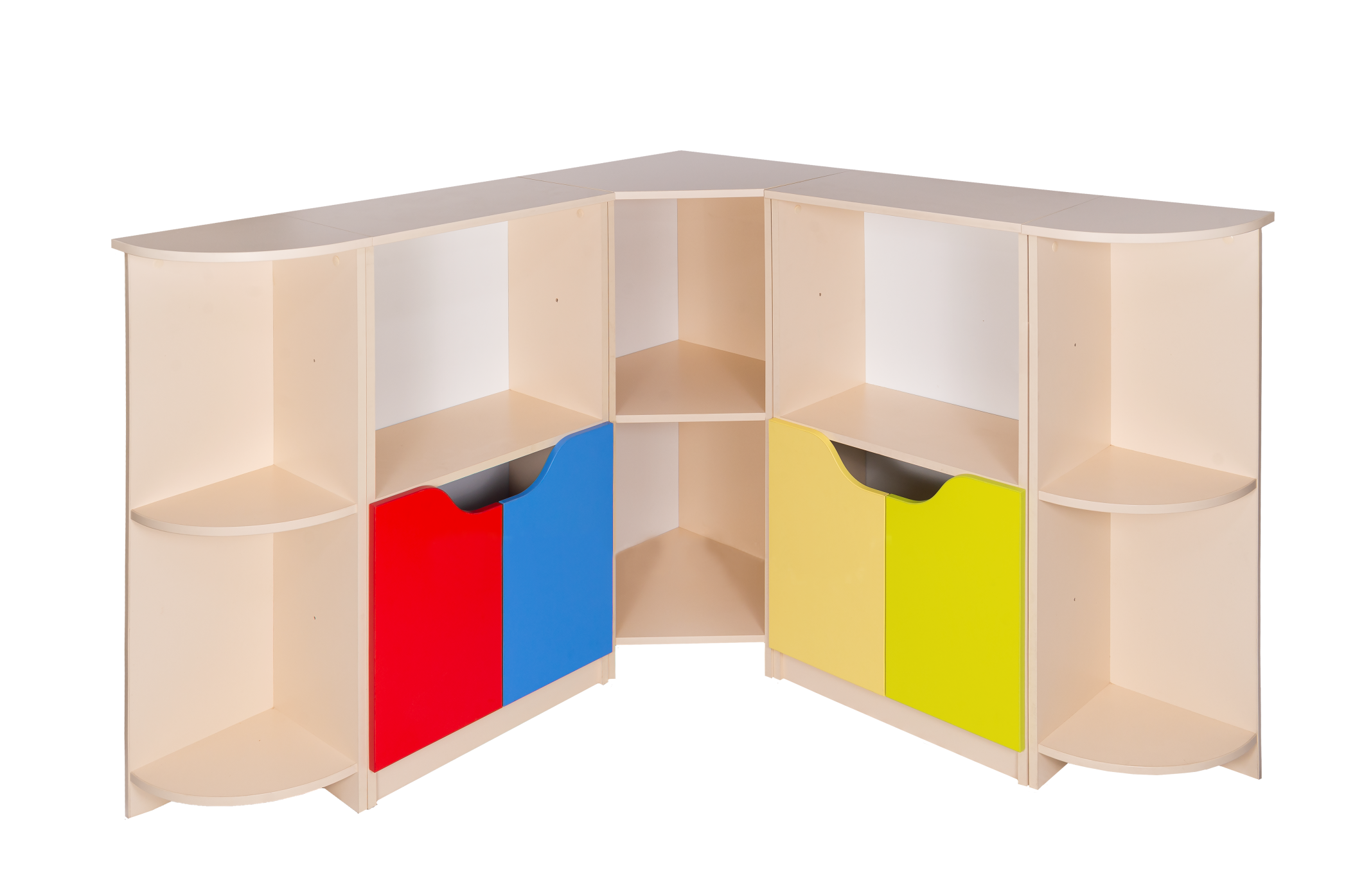 На полках угловой стенки расставляются игрушки, книги, канцелярия, учебные наборы. Мебель состоит из 3-х отдельных частей, в каждой по 2 яруса. Отделения полуоткрытые и закрытые (2 шт., внизу). Топ используется как рабочая поверхность. Цветные 2-створчатые дверцы оснащены вырезами вместо ручек.