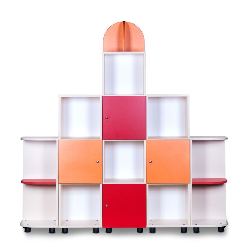 Стенка «Пирамида» используется в детском саду для хранения игрушек и дидактических пособий. Яркий и оригинальный дизайн игровой стенки дополнит интерьер игровой комнаты в детском саду.