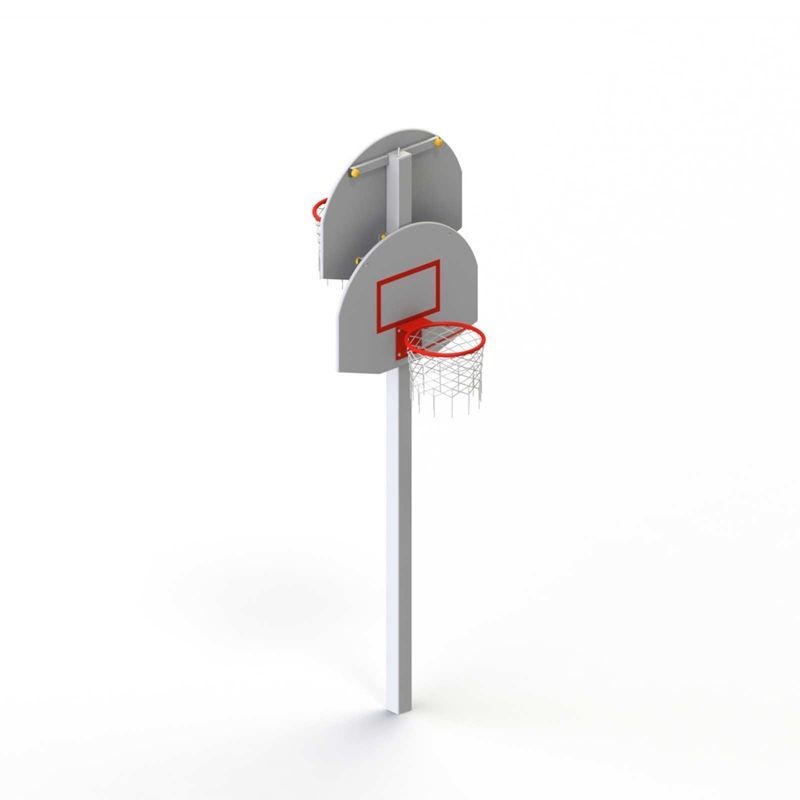 Баскетбольные щиты с разметкой закрепляются на разной высоте с двух сторон стойки. Стойка оснащена металлическими кольцами с капроновыми сетками.