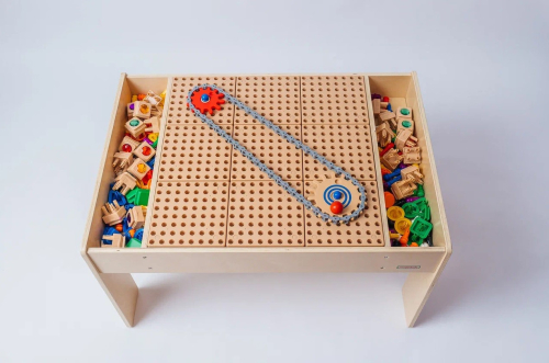 На поверхности стола есть отверстия, в которые можно вставлять цветные колышки. В боковой части размещаются два контейнера, в которых удобно хранить аксессуары для занятий. Подходит для индивидуальных и групповых занятий.