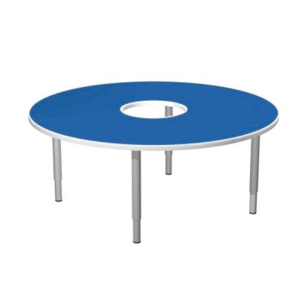 Опоры стола для коллективной работы регулируются под 0-3 ростовые группы. Столешница выполнена в форме кольца с круглым отверстием в центре.