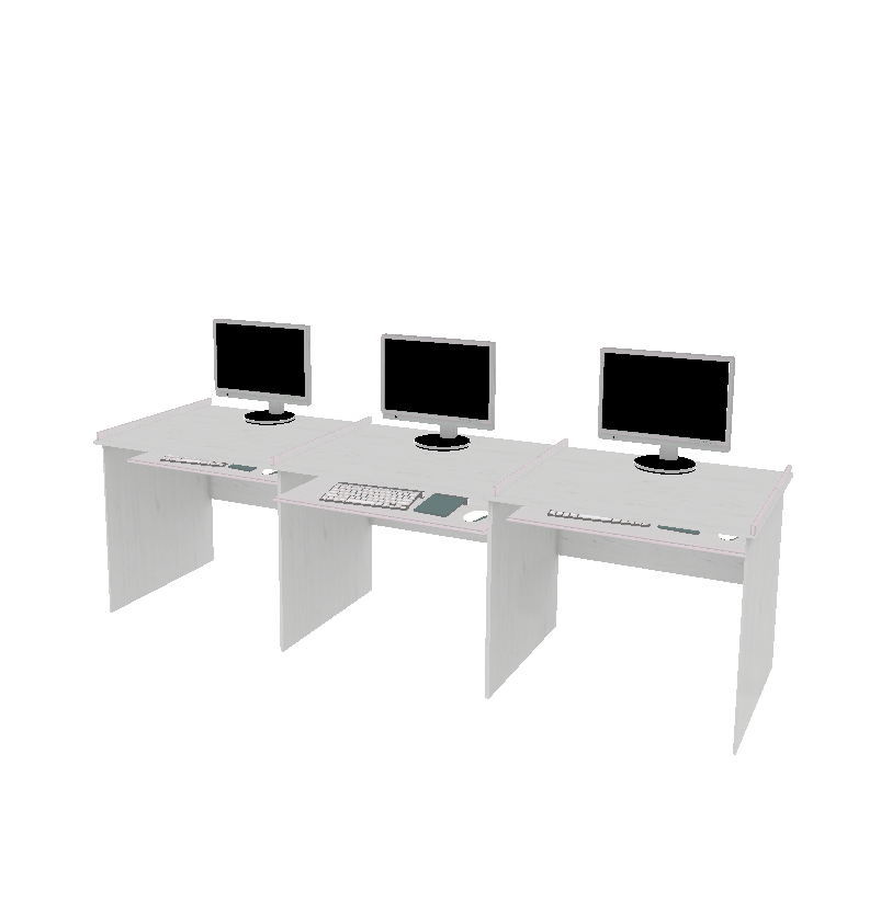 Компьютерный стол с параллельным размещением рабочих мест позволяет установить несколько ПК. Для каждой клавиатуры предусматривается отдельная выдвижная полка, рабочие места под прямоугольной столешницей окружаются опорными панелями из ЛДСП.