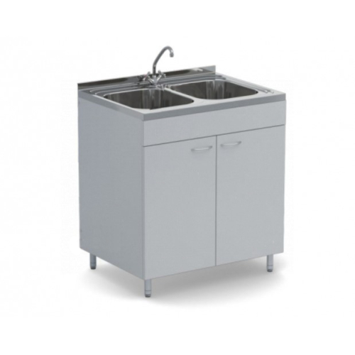 Конструкция состоит из мойки-столешницы с защитным экраном от брызг, тумбы с двумя дверцами, смесителя, сифона и гибкой подводки. Мойка изготовлена из нержавеющей стали, корпус — из ЛДСП.