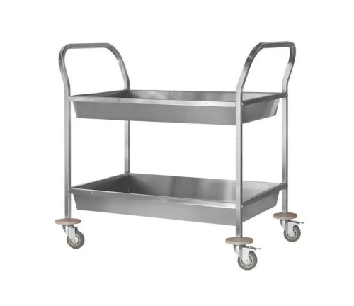 Тележка из нержавеющего металла служит для сбора посуды в столовой школы или ДОУ.