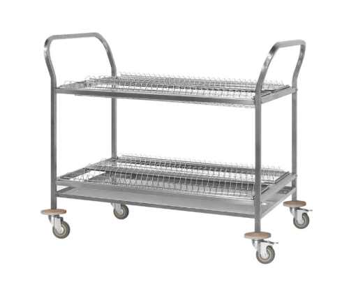 В тележке сушатся, хранятся и перемещаются тарелки, стаканы, подносы. Металл прослужит долгие годы, изделию не страшны механические повреждения и ржавчина.
