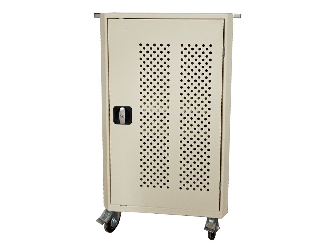 В закрытом передвижном шкафу хранятся и заряжаются планшеты, ноутбуки, мобильные устройства.