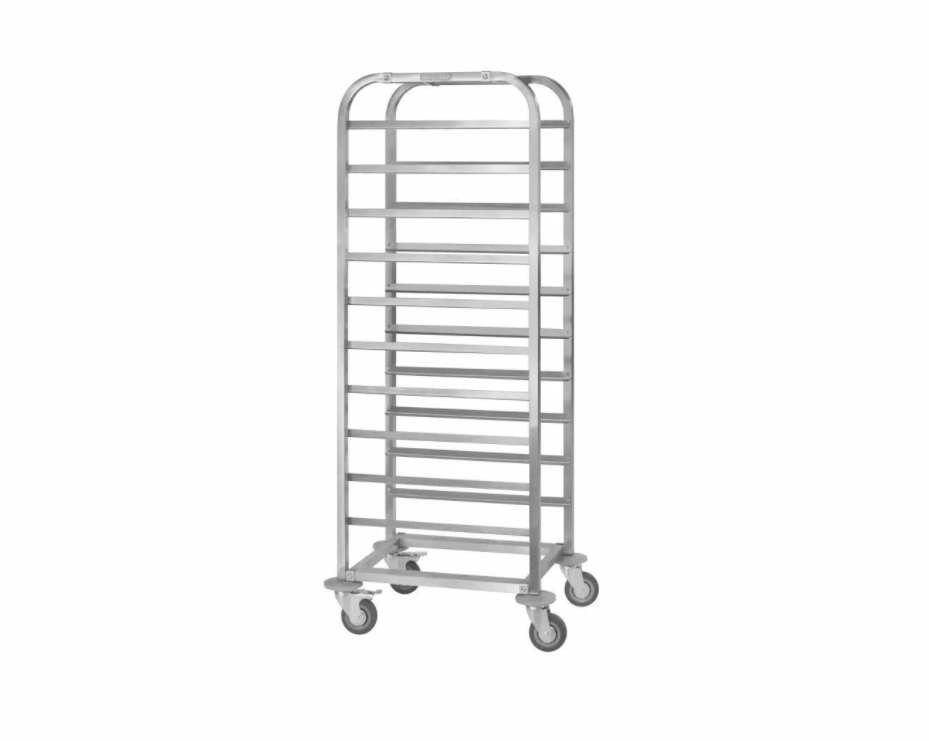 Разборная конструкция служит для хранения и перевозки гастроемкостей. Тележка-шпилька для профессиональной кухни оснащена 4-мя поворотными колесами с бамперами. Каркас жесткий, из профильных труб. Направляющие не ржавеют. Ограничители с безопасными гибами не дают емкостям, расположенным друг под другом, выпасть за пределы тележки.