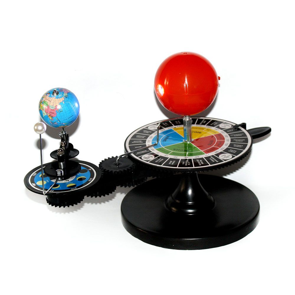 Неразборная модель крепится на подставку при помощи винта. Позволяет демонстрировать взаимное расположение и относительное движение Солнца, Земли и Луны. Помогает наглядно изучить такие явления, как смена времен года, лунные и солнечные затмения, изменения фаз Луны.