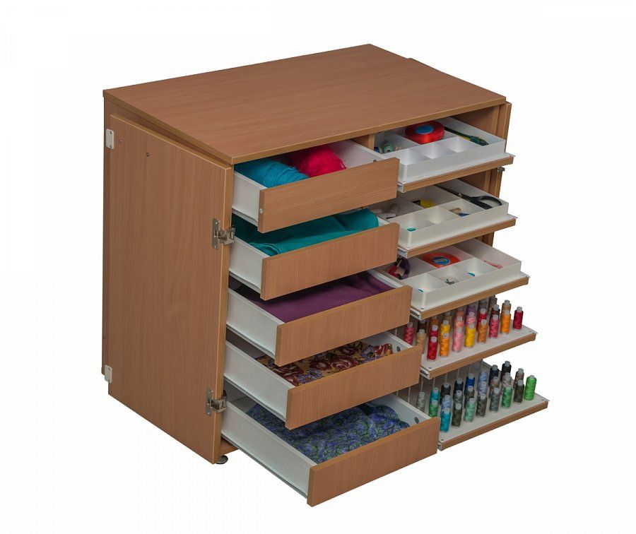 Тумба с 2-створчатой распашной дверцей и выдвижными элементами размещается в школьном кабинете домоводства и технологии. Специальная мебель помогает содержать в порядке швейные принадлежности и фурнитуру.