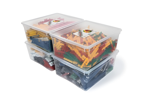 Обучающий комплект рассчитан на 7 человек. Детали крепятся друг к другу во всех плоскостях. В наборе 12 типов элементов семи разных цветов, из которых можно сконструировать до 100 видов моделей.