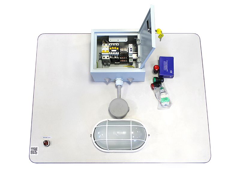 Стенд оснащается имитацией наружного освещения. Рабочее поле содержит реле, ключ, контактор, лампы, переключатели. Опционально поставляется обучающее ПО.