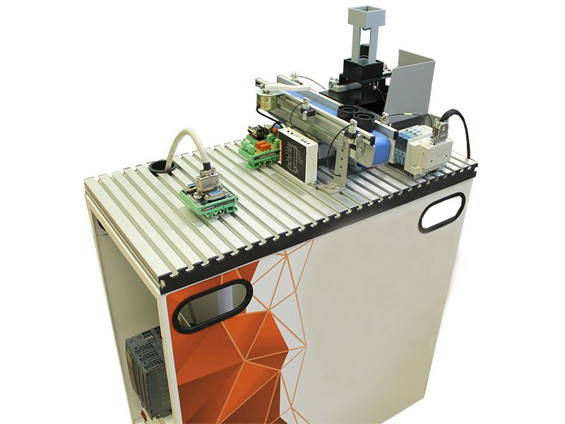 Учебный комплекс выдает заготовки и транспортирует их. Пользователю детально показан процесс работы конвейера, производственной установки.