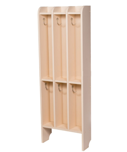 Небольшая двухъярусная вешалка — полезное дополнение к прочему оборудованию в детских комнатах для умывания в ДОУ. В 3-х секциях внизу или вверху устанавливаются металлические крючки, на них можно повесить 6 полотенец.