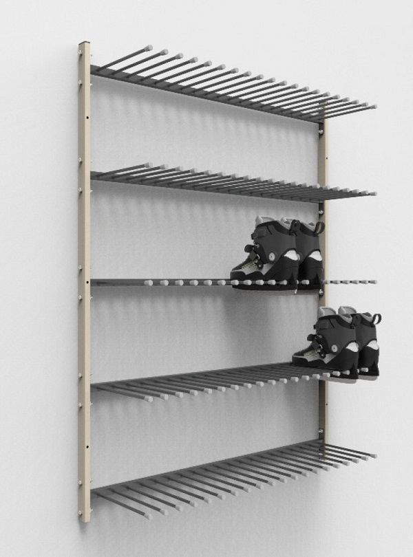 Вешалка с 5 рядами держателей подходит для хранения зимних и роликовых коньков в школе. Пристенная конструкция выполняется из усиленного профиля, покрывается влагостойкой краской.