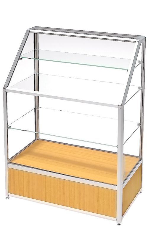 У стеллажа прямоугольное основание, глухая нижняя часть из ЛДСП и стеклянный отсек. Есть 3 прозрачные полки. Верх стеклянного фасада расположен под наклоном.