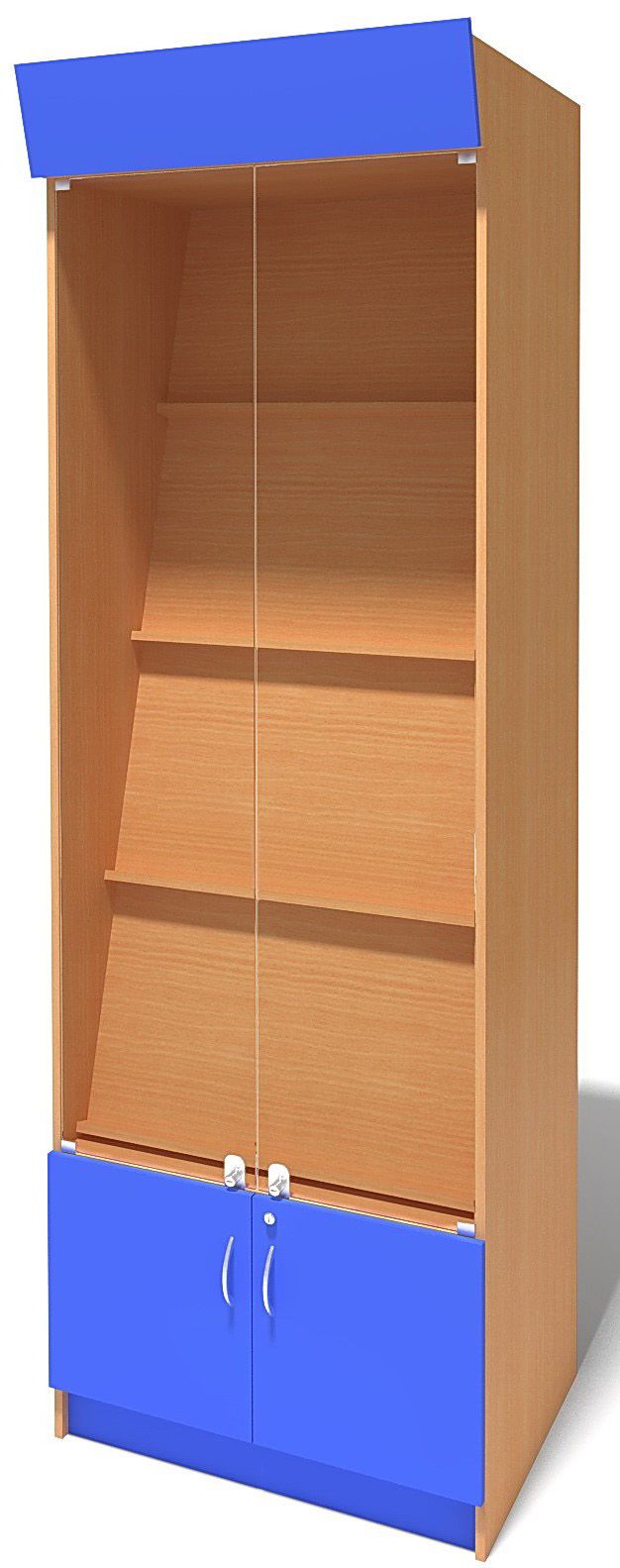 - четырьмя наклонными полками, закрытыми двумя стеклянными распашными дверцами.