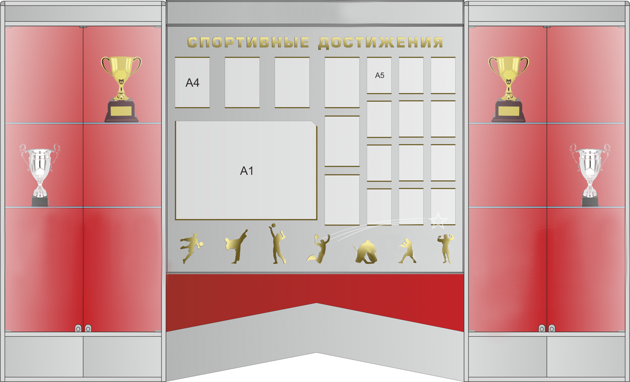 Композиция подходит для демонстрации спортивных достижений коллектива. Набор состоит из 2-х модулей витрины и стенда с карманами.