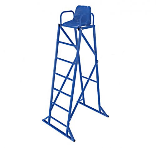Судейская вышка на металлокаркасе подходит для командных игр. 4 стойки на полозьях укреплены поперечинами и диагональными перекладинами. Наверху кресло с высокими подлокотниками, к нему ведет лесенка.