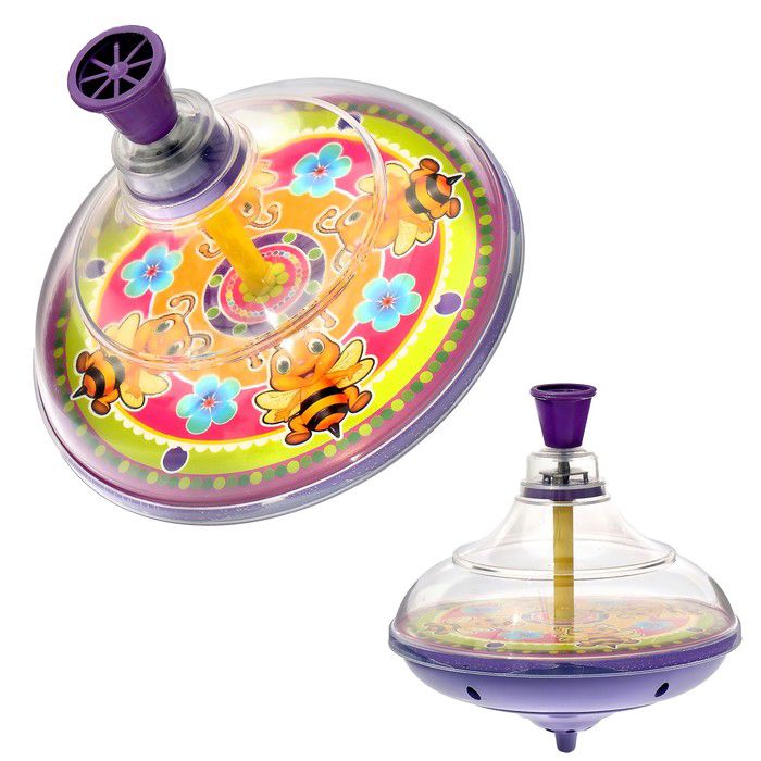 Прозрачная юла с цветным диском вращается механически. Ребенок наблюдает за процессом инерции, развивает координацию движений. Диск украшен изображением пчелки.