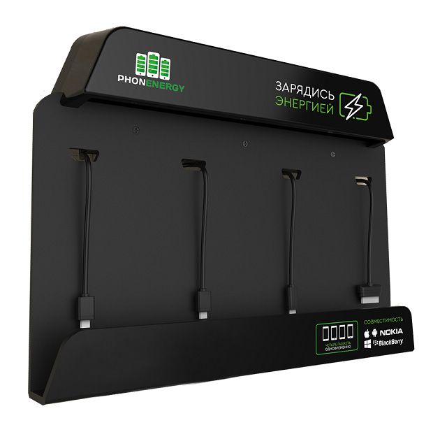 Станция со сменными USB-кабелями используется для подзарядки электронных устройств. Конструкция монтируется к стене. В карман помещается до 4-х гаджетов.