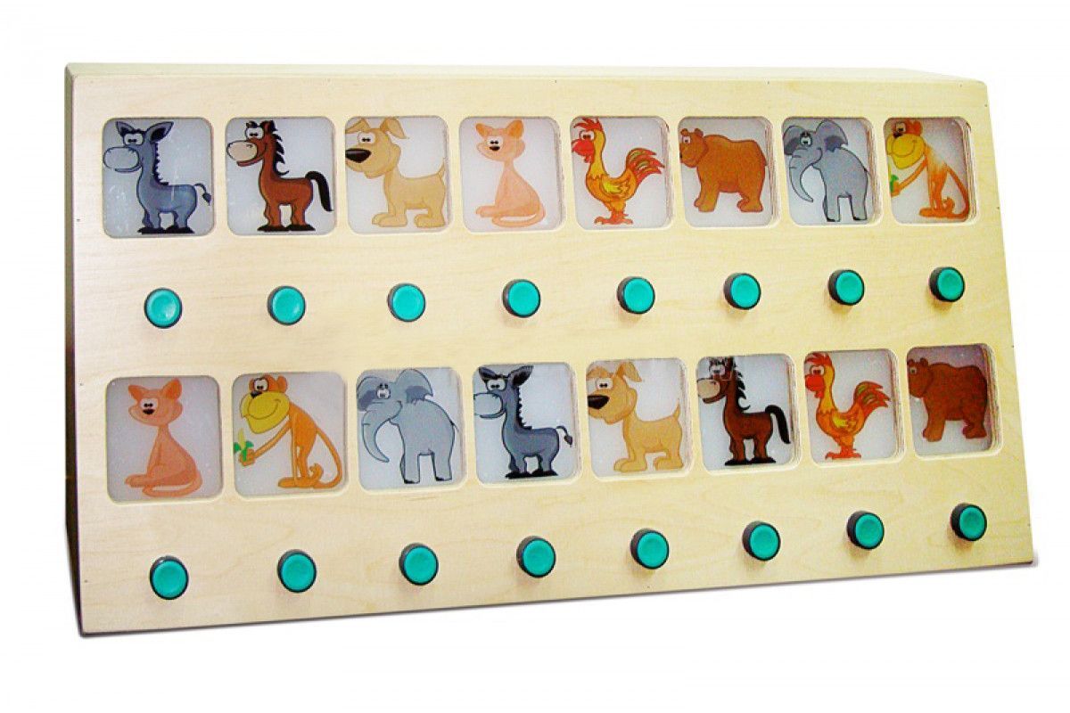 На панели есть 16 кнопок — по 8 в каждом ряду. Над ними расположены изображения слона, собаки, осла, петуха, обезьяны, лошади, кошки и медведя — по 2 изображения каждого животного. При нажатии кнопки из верхнего ряда соответствующее изображение начинает светиться. Цель игры — найти в нижнем ряду идентичное изображение и нажать на кнопку под ним. Если соответствие установлено, воспроизводится звук, который издает выбранное животное. Панель позволяет изучать окружающий мир в игровой форме.